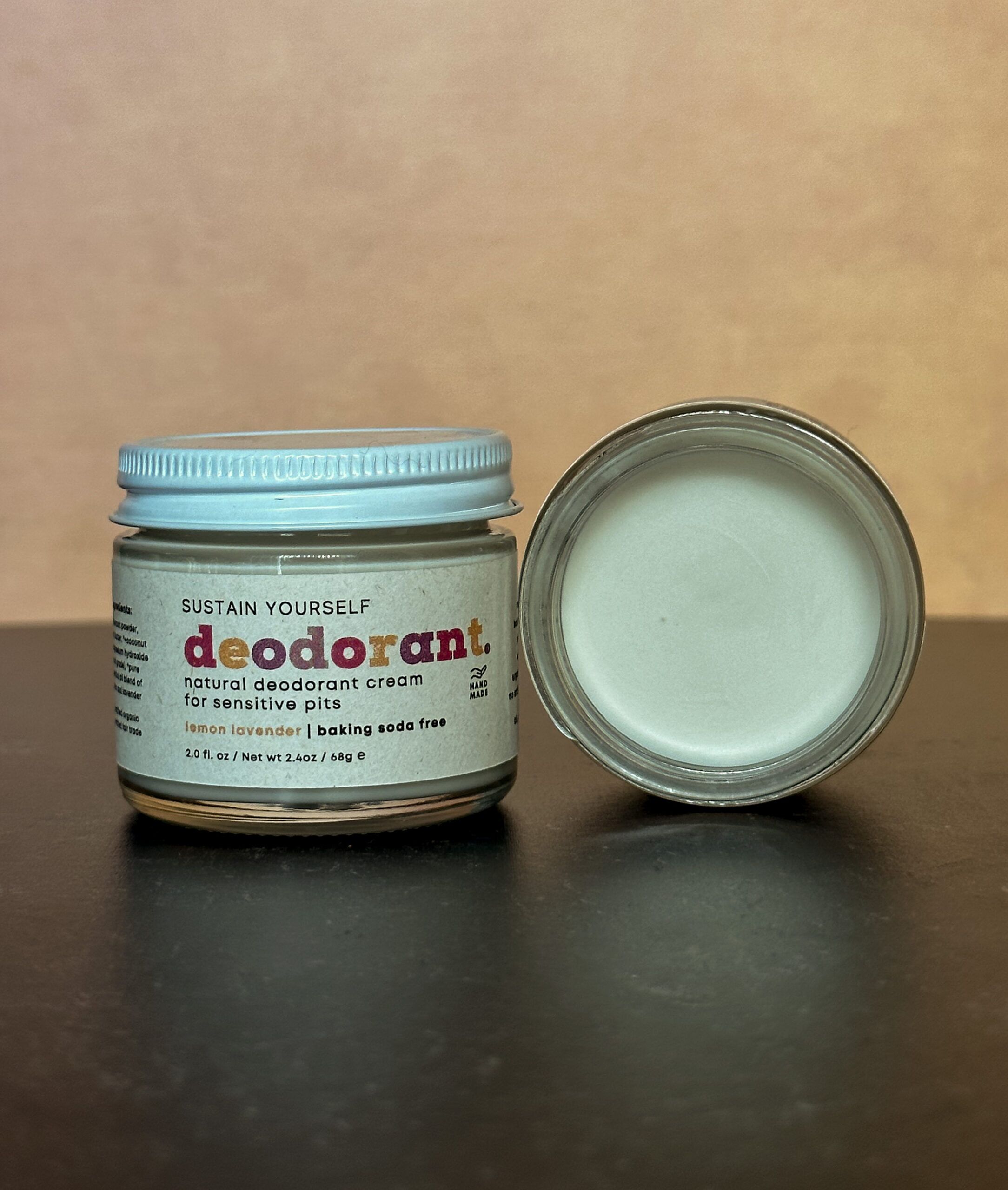 Sustain Yourself’s formula is vegan (no beeswax) and baking soda free (a common irritant in natural deodorant) and is handcrafted in small batches using gentle ingredients that effectively battle odor, while keeping your pits soft, dry, and rash-free.