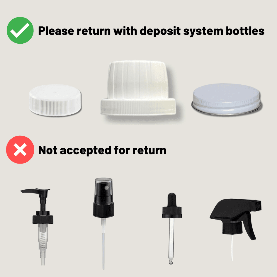 - We take back bottles with screw top lids only–no pumps, droppers, or spray tops.